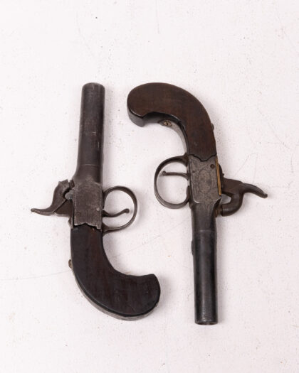 A cased pair of antique percussion cap pistols. The pistols feature engraved metalwork and wooden handles. The case is made of wood and lined with red velvet. One pistol features inscription 'Lombard Street, London'. The pistols show signs of age and use, commensurate with age.