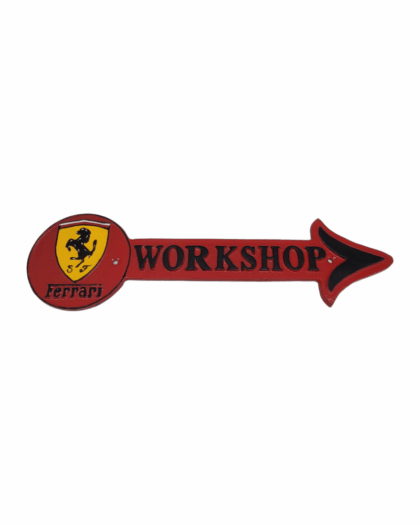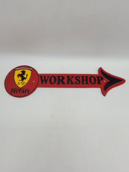 A red cast iron sign in the form of an arrow pointing right. Bears Ferrari logo and “Workshop”.