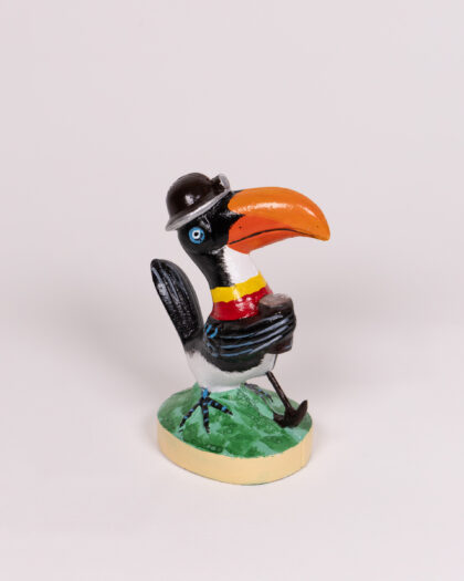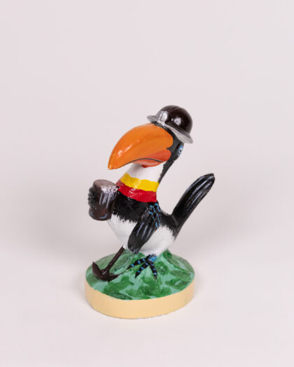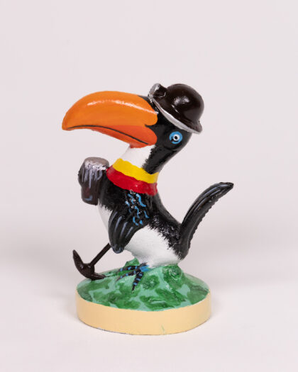 This cast iron toucan's jaunty pose raises a smile! Expertly crafted from cast iron, this toucan ornament is handpainted with vibrant colours. The toucan itself is perched on a green grassy base, is sporting a hat and is happily clutching a pint of beer under his wing. Expert metalwork craftsmanship is on display, especially on the wings and feet. Standing at 15cm high, he definitely makes an impression, and is great for decorating home offices, home bars, man caves or garages.