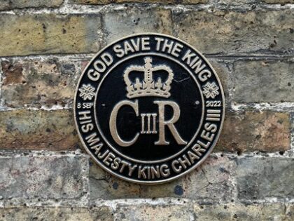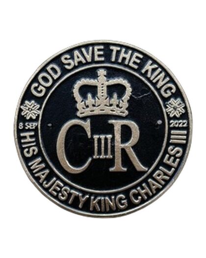This brand new metal wall plaque commemorates the coronation of King Charles III. The circular plaque features a black background with gold lettering that reads 'God Save The King, His Majesty King Charles III' around the edge. The central design shows a crown above the royal cypher 'CIIIR', with the date '8 SEP 2022' flanking either side. Made from metal, this plaque is designed to be wall-mounted and makes a fitting tribute to a historic event. This plaque would look great displayed in a living room, home office, or library, adding a touch of regal charm to any space.