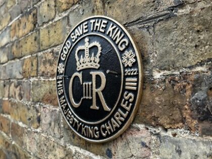 Brand new metal wall plaque commemorating the coronation of King Charles III. Features a crown and 'God Save The King' text in gold on a black background.