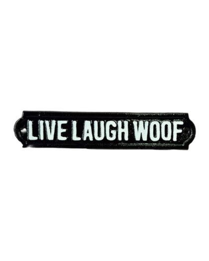 Black cast iron 'Live Laugh Woof' sign for dog lovers. Perfect home decor for dog owners.