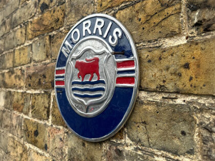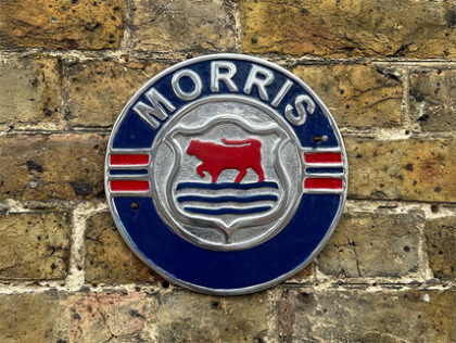 Morris car metal badge. Features the distinctive bull logo in red, silver and blue, with the brand name in bold lettering. Ideal for a garage, home bar or office.
