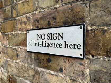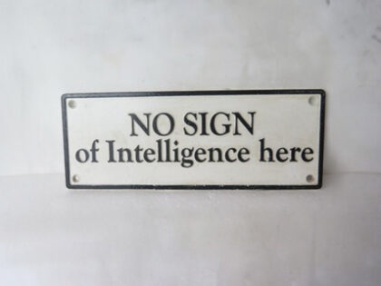 Humorous rectangular cast iron wall sign with a black border. Reads 'No Sign of Intelligence here' in black text on a white background. Brand new.
