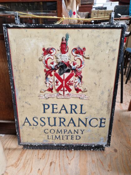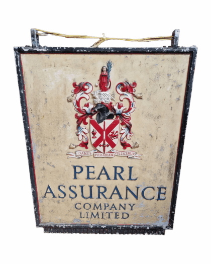 A large, heavy cast iron double-sided hanging sign for Pearl Assurance Company Limited.