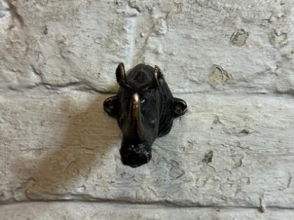 Unique rhino head wall hook. Metal construction with a striking gold horn. Perfect for adding character to any room.