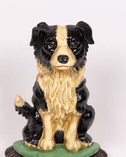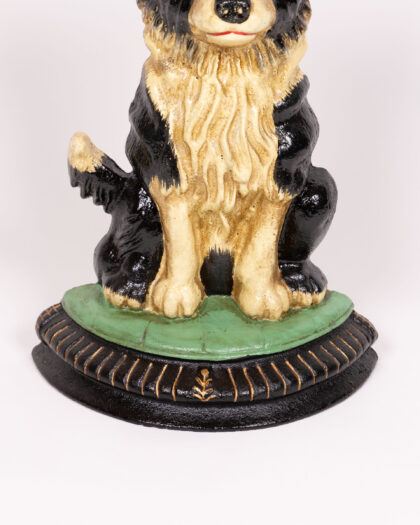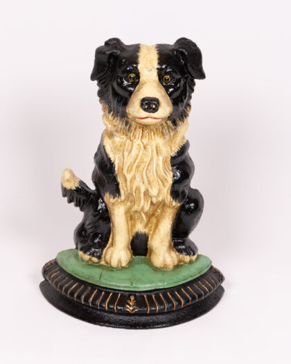 This cast iron doorstop features a faithful rendition of a handsome sheepdog, with distinctive black and white markings. It sits attentively on a round, ornately detailed base, which gives the piece a vintage feel. The expressive eyes and detailed fur texture are highlighted with a white color that contrasts with its black coat. A functional item that doubles as a charming piece of decor, you can totally imagine it standing beside a country farmhouse kitchen door! Weighing in at 3.7kg and 33cm in height, it's more than bulky enough to keep the heaviest door open. A lovely charming design!