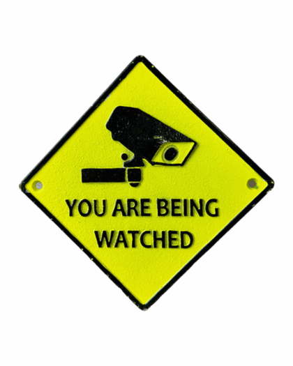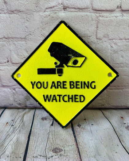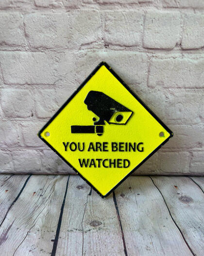 This novelty cast iron sign features the phrase 'You Are Being Watched' in raised black lettering against a bright yellow background. A raised camera icon adds to the surveillance theme. The sign is made of cast iron with a black trim. It is ideal for adding a touch of humour to a home, office, or man cave. Surface imperfections may be present.