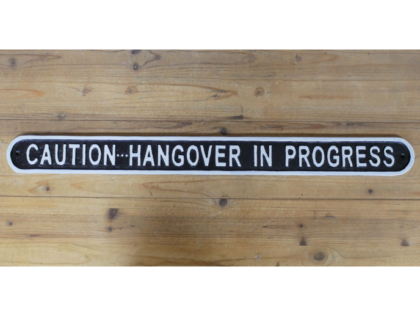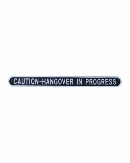 'Caution Hangover in Progress'. Perfect for adding a touch of humour to your home or bar space. Its robust construction ensures durability and longevity.