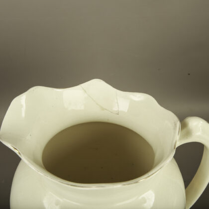 The jug has been damaged and repaired at the rim.