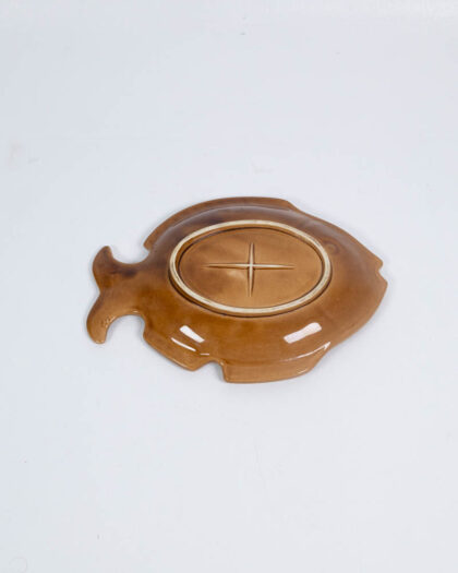 This is a ceramic dish that has been shaped like a fish. The dish has been glazed in varying shades of brown and red. The front of the dish features a bright red design within the body, surrounded by tan colour. The rest of the fish, including the head, tail, and fins, are glazed in a glossy brown finish. The bottom of the dish is a solid brown with a raised star pattern. The dish is in good condition and would make a decorative addition to a home.
