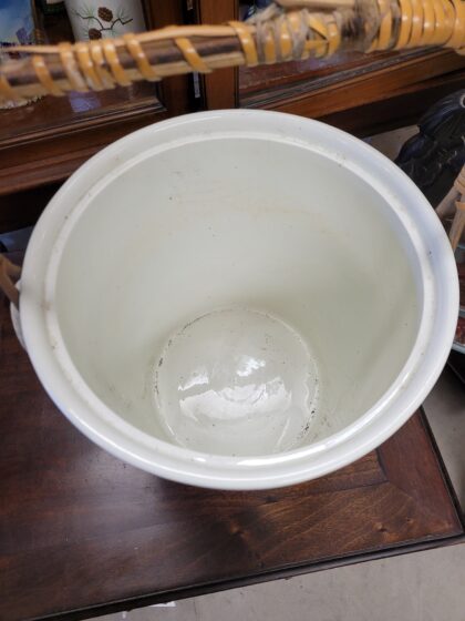 White ceramic milk bucket with lid and handle.