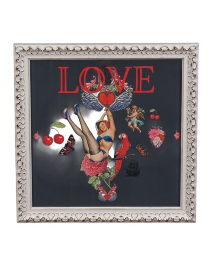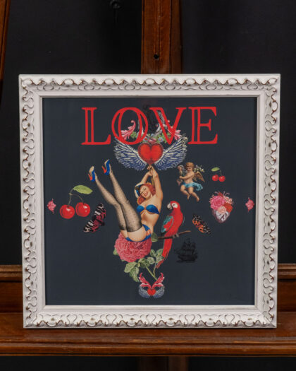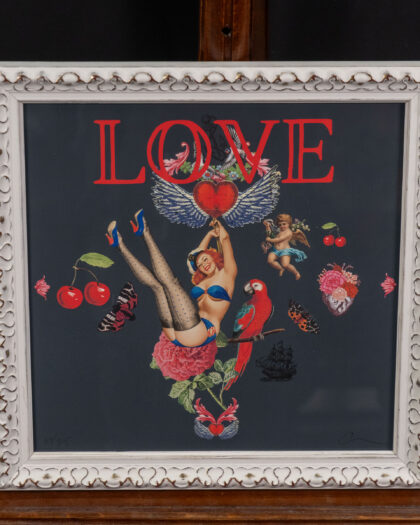 This is a framed print by Myrtle and Mary. The print features a vintage pin-up style design with the word 'LOVE' prominently displayed in red. The artwork includes images of a winged heart, a parrot, cherries, and other decorative elements. The frame is made of wood and painted white with a distressed finish, adding to its vintage aesthetic. The print is numbered 10/95. Excellent condition and ready to display.
