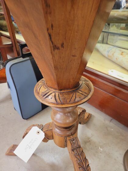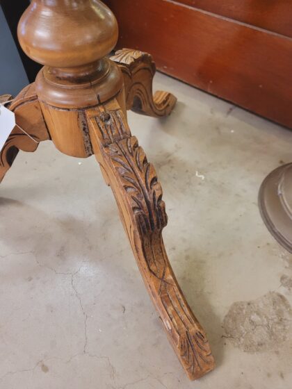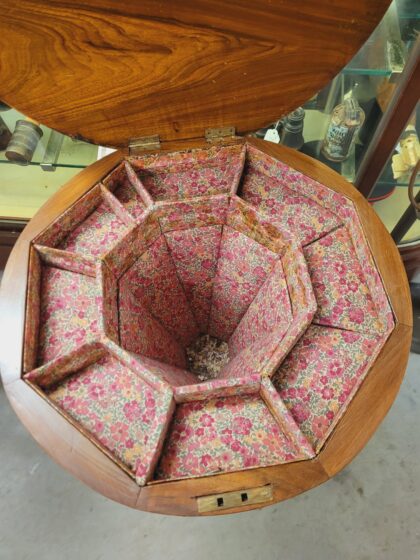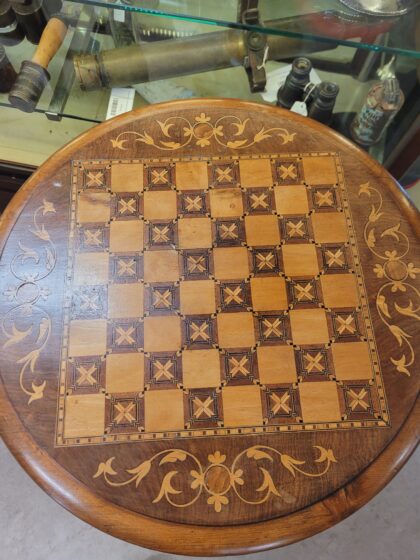 A small round wooden table with inlaid chessboard. The tabletop hinges to reveal floral lined craft table storage compartments. Ornate carving to feet.