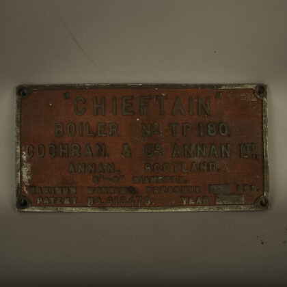 A solid metal sign taken from a Scottish boiler.