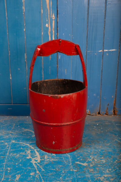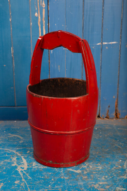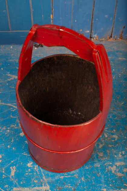 Large red-lacquered coopered water bucket.