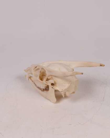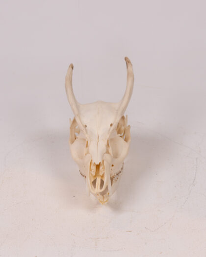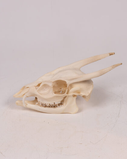 This Chinese Water Deer Skull features prominent horns and natural bone texture. It's an interesting decorative piece that adds a touch of natural history to any room. Ideal for display in a home, lounge, or man cave.