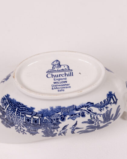 This is a Churchill England Willow gravy boat, decorated in the traditional Willow pattern in white and blue. The pattern depicts a traditional oriental scene, including buildings, a bridge, and birds. The boat has a pouring spout and a loop handle for easy use. The underside of the boat features the Churchill logo and confirms it is dishwasher and microwave safe. The piece is in good condition, although there are some signs of use.