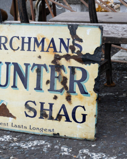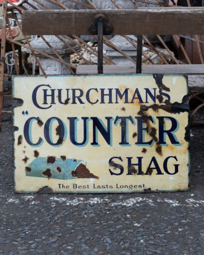 Original Churchman's Counter Shag tobacco enamel sign. Distressed charm, ideal for collectors or vintage-inspired decor.