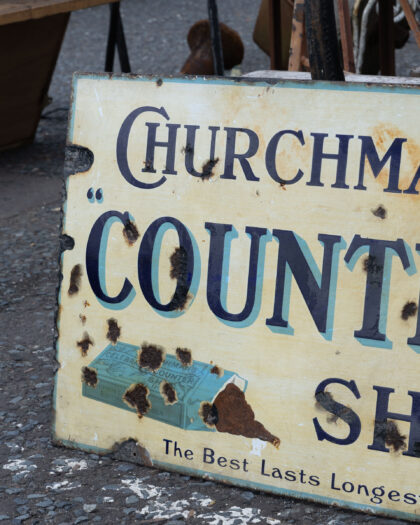 Churchman's Counter Shag Tobacco advertising sign. The sign features a cream background with blue lettering. There is some rust and wear that adds to the vintage charm. The sign reads "Churchman's Counter Shag - The Best Lasts Longest." There is an image of a packet of tobacco. This sign would make a unique addition to any collection or a statement piece for a vintage-inspired space. The sign shows some wear and tear consistent with age, including rust, scratches, and discoloration. The edges are also slightly chipped and worn, enhancing its authentic vintage appeal.