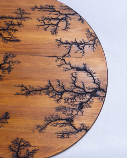 This is a round wooden board. The design is created using a fractal wood burning technique (also known as Lichtenberg figures). The dark black lines contrasts beautifully with the natural wood.