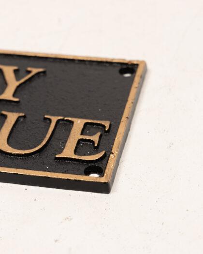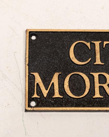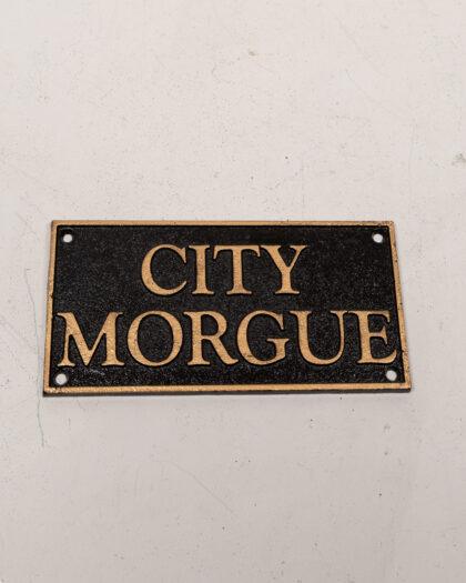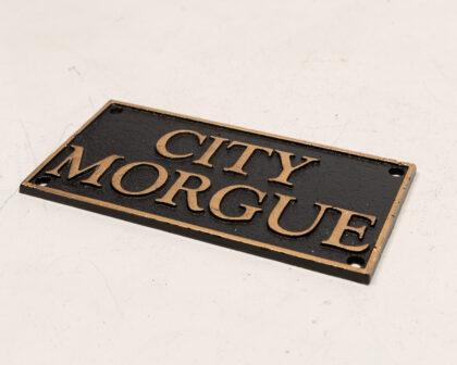 Cast iron plaque displaying 'City Morgue', in gold writing on black background.