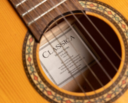 Classica 3/4 size student classical guitar. Light wood finish, nylon strings. Good condition, ideal for beginners. Made in Europe.