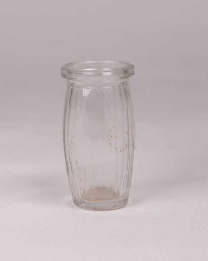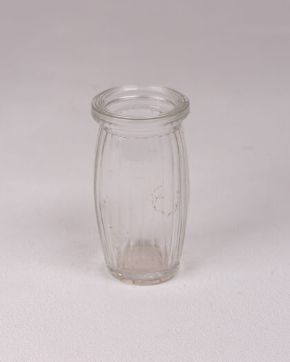 This charming vintage clear glass jar features a distinctive barrel shape and elegant ribbed detailing running vertically along its length. Its transparent glass allows for easy visibility of contents, making it ideal for storing small items like spices, beads, buttons, or tiny keepsakes. With its petite and versatile design, this jar is perfect for organizing small essentials or adding a touch of vintage character to any shelf or tabletop. It is in good condition with minor marks from prior usage, consistent with its age and adding to its authentic appeal.