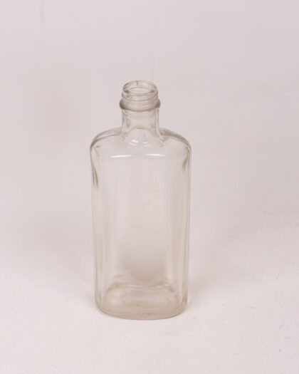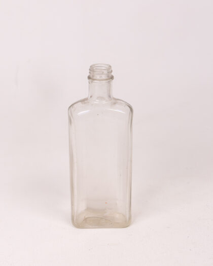 A clear glass bottle with a rectangular body and a short, narrow neck. It is empty and clean, showcasing the clarity of the glass. The bottle's shape and style suggest a vintage or antique origin. The simple design makes it suitable for various purposes, from decorative display to functional use. The bottle is in good condition, appearing well-preserved.