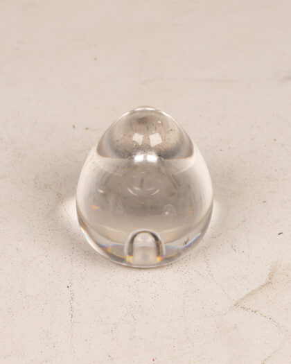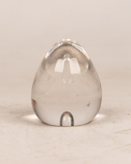A clear, solid glass paperweight in an egg shape. Its smooth, rounded form reflects light beautifully, adding a touch of elegance to any desk or shelf. This charming paperweight is not only functional but also serves as a decorative accent, perfect for keeping papers in place or simply as an aesthetic piece. Its simple design ensures it complements any decor style, making it a versatile addition to any home or office setting. The glass has a few minor imperfections which add to its character.
