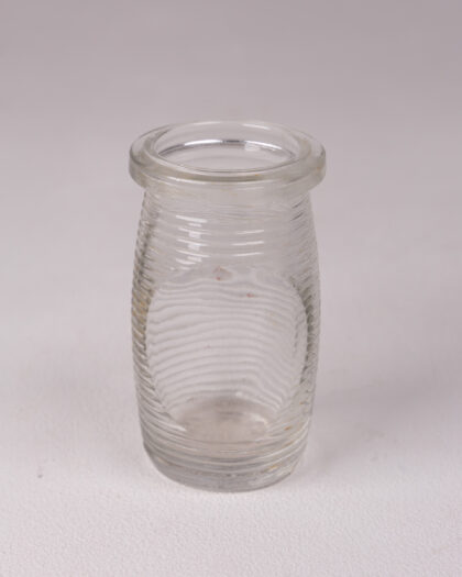 Discover this charming small clear glass jar, distinguished by its unique ribbed design and a smoothly rounded rim. Its compact 'Actimel' size makes it incredibly versatile, perfect for tiny floral arrangements, storing small items like spices or trinkets, or simply as a standalone decorative accent. This jar possesses a classic, simple silhouette that beautifully complements a variety of decor styles, from minimalist to rustic. Despite its vintage appearance, it remains in excellent condition, ready to add a touch of understated elegance and practical charm to any room.