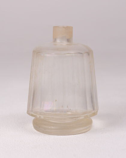 Small vintage clear glass bottle with ribbed sides and a frosted finish, perfect for decorative display.
