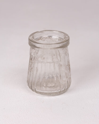 Discover the timeless appeal of this charming vintage clear glass jar, perfect for adding a touch of classic elegance and practicality to your home. This compact jar features a simple cylindrical shape adorned with distinctive vertical ribs, offering both visual interest and a tactile feel. Its clear glass construction allows for easy viewing of contents, making it ideal for organizing small items in the bathroom, kitchen, or on a vanity. Despite its age, the jar is in good overall condition, with minor signs of wear that authentically enhance its vintage character. Use it as a decorative accent, a unique holder for trinkets, or for everyday storage.
