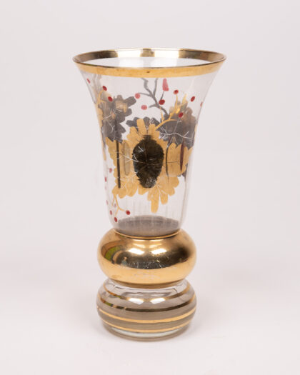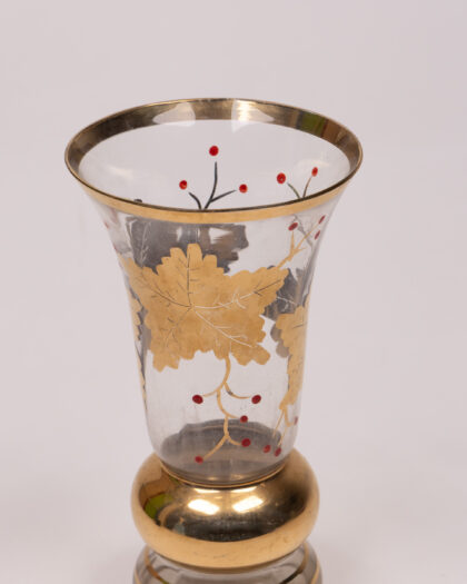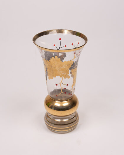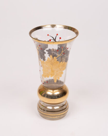 This is a clear glass vase that is enhanced with golden accents and a unique design. The vase features a bulbous centre that transitions into a slender neck. The rim of the vase is trimmed with a gold band. The body of the vase has decorative transfer-printed leaves in gold and black with little red berries. There are gold bands at the base too. This decorative piece would make a great addition to any home.