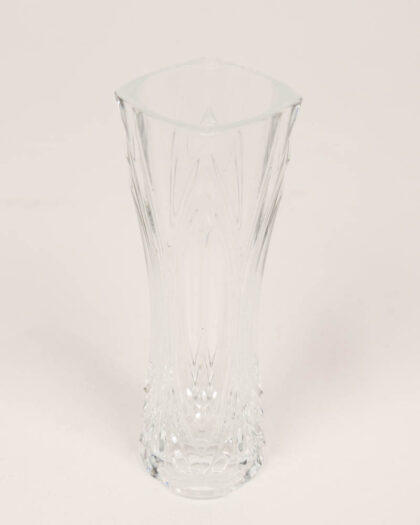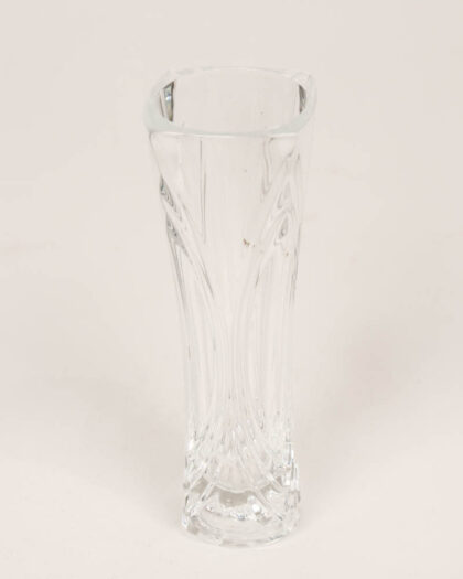 This is a clear glass vase featuring a contemporary wave pattern design. The vase has a square-shaped opening and tapers down to a thicker base with vertical wave-like pattern giving a modern aesthetic. 17cm