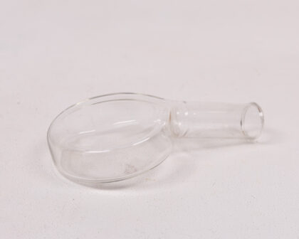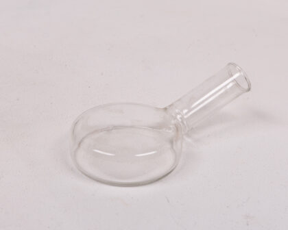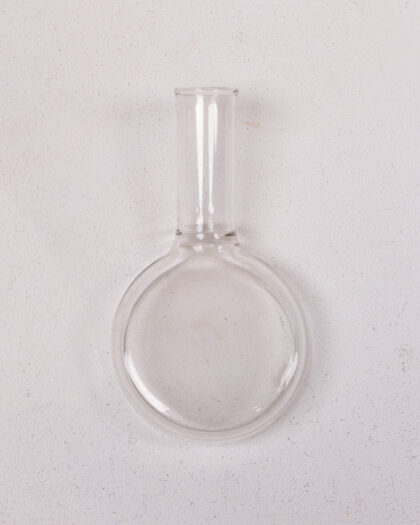 This is a clear glass laboratory flask. It is a round-bottomed flask with a long, cylindrical neck. It is made of clear glass and has a smooth, polished surface. This flask is perfect for a variety of laboratory applications, such as mixing, heating, and storing liquids. It can also be used as a decorative item or as a unique gift for a science enthusiast. The condition of the flask is excellent, with no chips or cracks.