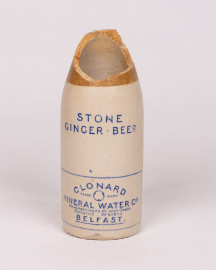 'Clonard Mineral Water Co.' stone ginger beer bottle from Belfast. The primary colours are cream and brown. The bottle features blue lettering. It has a cylindrical shape, typical of vintage beverage containers. Note the extensive damage to the neck of the bottle. It has some hairline cracks and crazing in the glaze, consistent with age and use. This bottle offers a glimpse into the past, perfect for collectors or as a decorative accent.