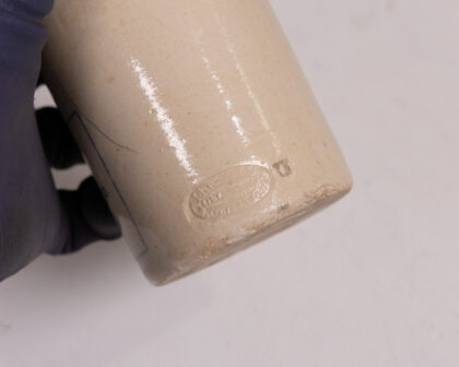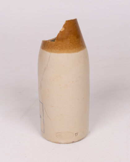'Clonard Mineral Water Co.' Belfast stone ginger beer bottle. Cream and brown stoneware with blue lettering. Damaged condition.