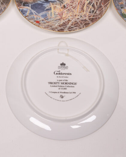 This is a set of seven decorative plates, likely crafted from ceramic. Each plate features a different bird image, set against a wintry landscape. The colour palette leans toward browns, blues, and greens, capturing a frosty winter scene. The plates are edged with a gold trim, adding a touch of elegance. The backstamp indicates they are 'Coalport Goldcrests' plates, from the 'Frosty Mornings' collection by David Feather, a limited edition from 1994. All plates appear to be in good condition and are suitable for decorative purposes. Display stands are not included.