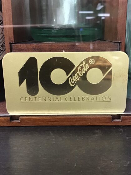 A cased diorama containing three different bottles of different eras in order to celebrate the centenary of Coca-Cola.