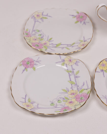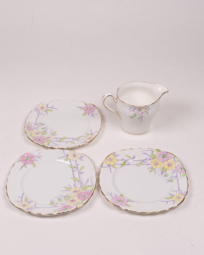 Vintage Colclough China tableware set, made in England. Includes jug and three plates with floral pattern. Pretty pastel shades, gilt trim. Lovely!