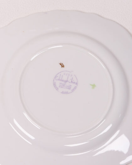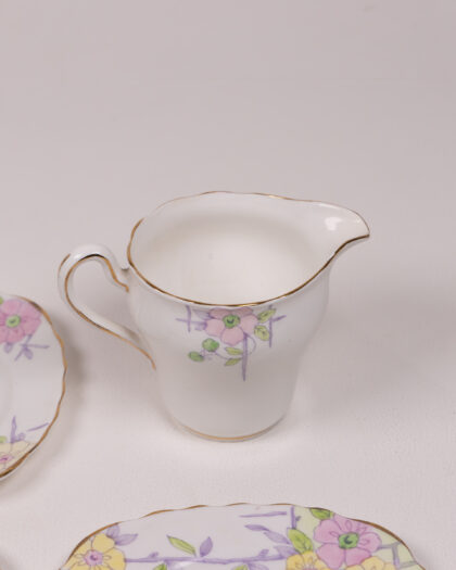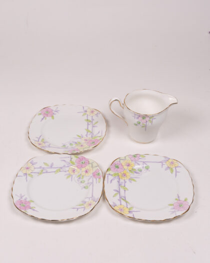 A beautiful vintage bone china tableware set by Colclough China, made in England. This set includes a small milk or cream jug with a handle, and three small side plates. All of the items are white with gilt trim. The design features a floral and trellis pattern with pretty pastel shades of pink, yellow and lilac. The base of each item features the Colclough China stamp and the number 6553. There are some very minor signs of age related wear, commensurate with age, but overall this set is in very good condition and would make a lovely addition to a vintage china collection.