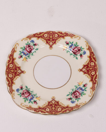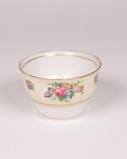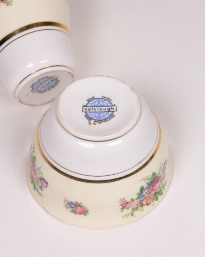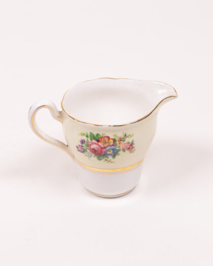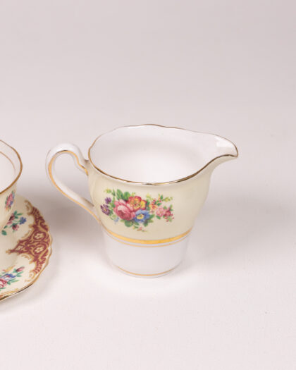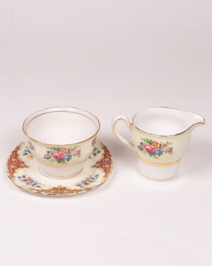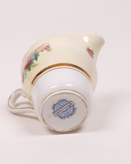 This vintage Colclough bone china tea set comprises a teacup, saucer and milk jug. The cream coloured set is decorated with pink, red and blue flowers, with green foliage. The saucer has a floral garland design. Gold trim lines the edge of the cup, saucer and jug. This is a decorative item for display, or use. The cup is 8cm high, the saucer 14cm in diameter, and the jug 9cm high. In good condition.