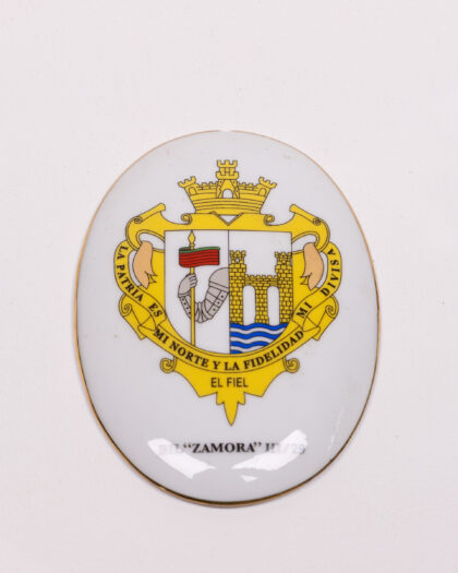 Discover a unique piece of military history with this vintage Spanish Army 'BIL ZAMORA' collectible badge. This striking oval badge features a meticulously detailed coat of arms, complete with a majestic castle, an armoured arm proudly holding a flag, and an ornate crown at its pinnacle. The vibrant crest is beautifully framed by a gold trim, adding to its distinguished appearance. Encircling the central motif is the poignant inscription 'LA PATRIA ES MI NORTE Y LA FIDELIDAD' (The Homeland is My North and Fidelity), with 'EL FIEL' (The Faithful) positioned below, underscoring its deep symbolic significance. Perfect for military history enthusiasts or collectors of unique memorabilia, this badge is presented in very good condition, showing only minimal signs of wear consistent with its age. A truly distinctive addition to any collection.