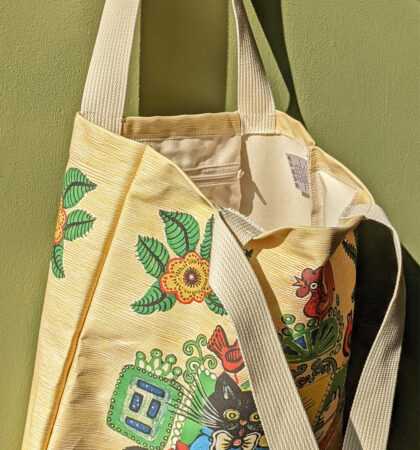 Canvas tote bag featuring a charming folk art-style design with cats and birds. Durable with neutral straps. Ideal for shopping or everyday use.