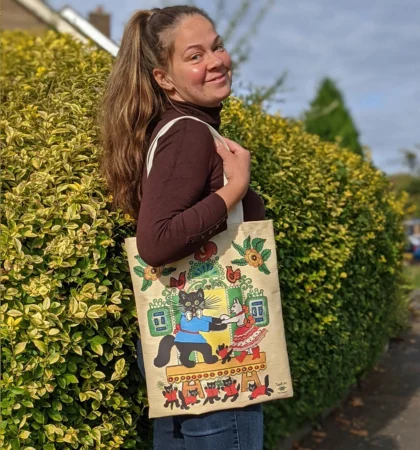 This brand new canvas tote bag showcases a delightful folk art-style design. The central image features cats dancing, surrounded by stylized floral and bird motifs. The background is a cream colour. The bag is made of durable canvas and has neutral coloured straps. It is a practical and decorative item that would be a great addition to any home. The bag is ideal for shopping, carrying books, or everyday use.