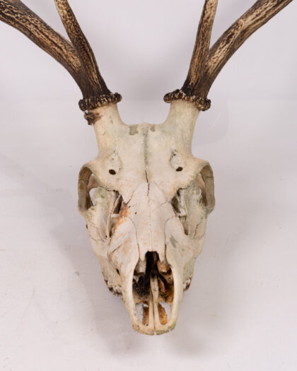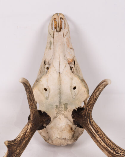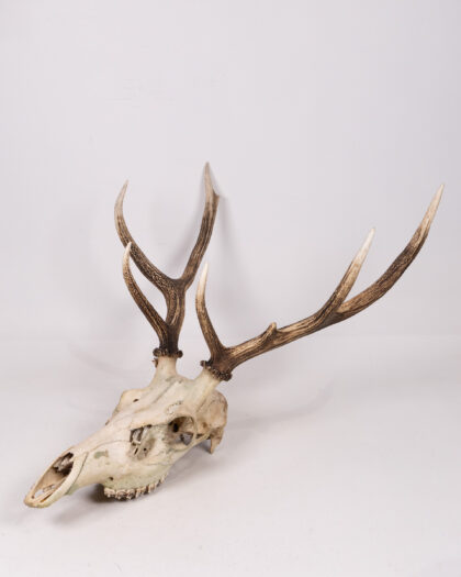 Striking deer skull with antlers. This piece is a real statement, bringing the beauty of nature into your home. The skull exhibits natural wear, adding to its authenticity and vintage appeal. The antlers are in excellent condition. Would look great mounted on a wall or displayed on a shelf, perfect for adding a touch of rustic charm to any room. Please note the condition of the skull, with small cracks and signs of age.