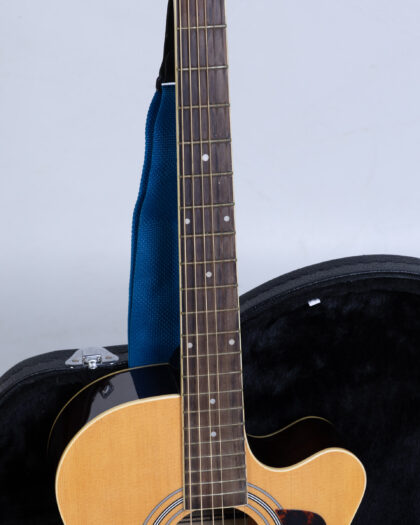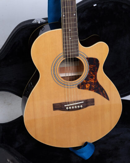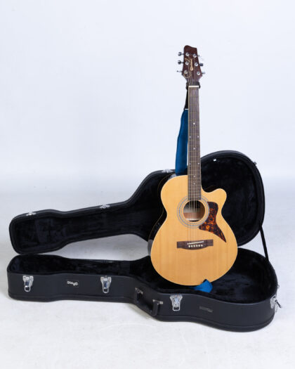 Discover the Copeland acoustic guitar, a beautifully crafted instrument featuring a natural finish and a modern cutaway design for easy access to higher frets. Equipped with quality Fishman electronics, this guitar delivers clear, amplified sound, making it perfect for both practice and performance. It boasts a comfortable mahogany neck, ensuring smooth playability. This preowned guitar is in very good condition and plays exceptionally well, offering a fantastic opportunity for musicians. Included is a robust Stagg hard case, providing secure storage and reliable transport for your instrument, protecting your investment for years to come.
