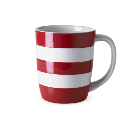 Classic Cornishware 12oz mug in red and white stripes. A timeless kitchen essential, perfect for tea, coffee, or hot chocolate. Collectible design.