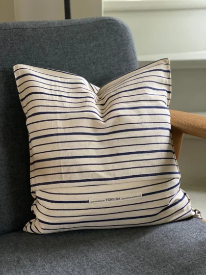 Cushion cover from Tensira. Features 100% cotton fabric and horizontal blue stripes on a off-white background.